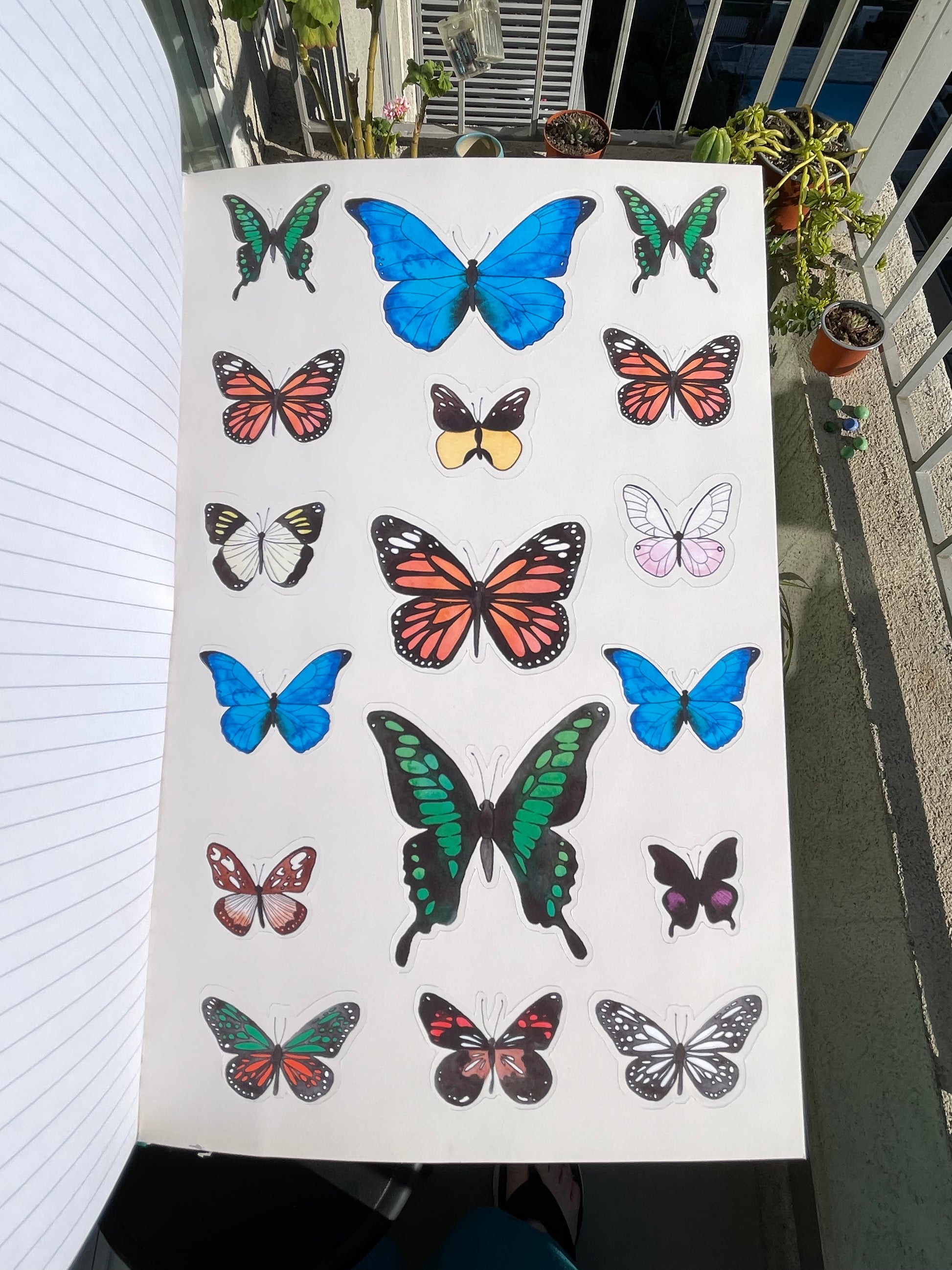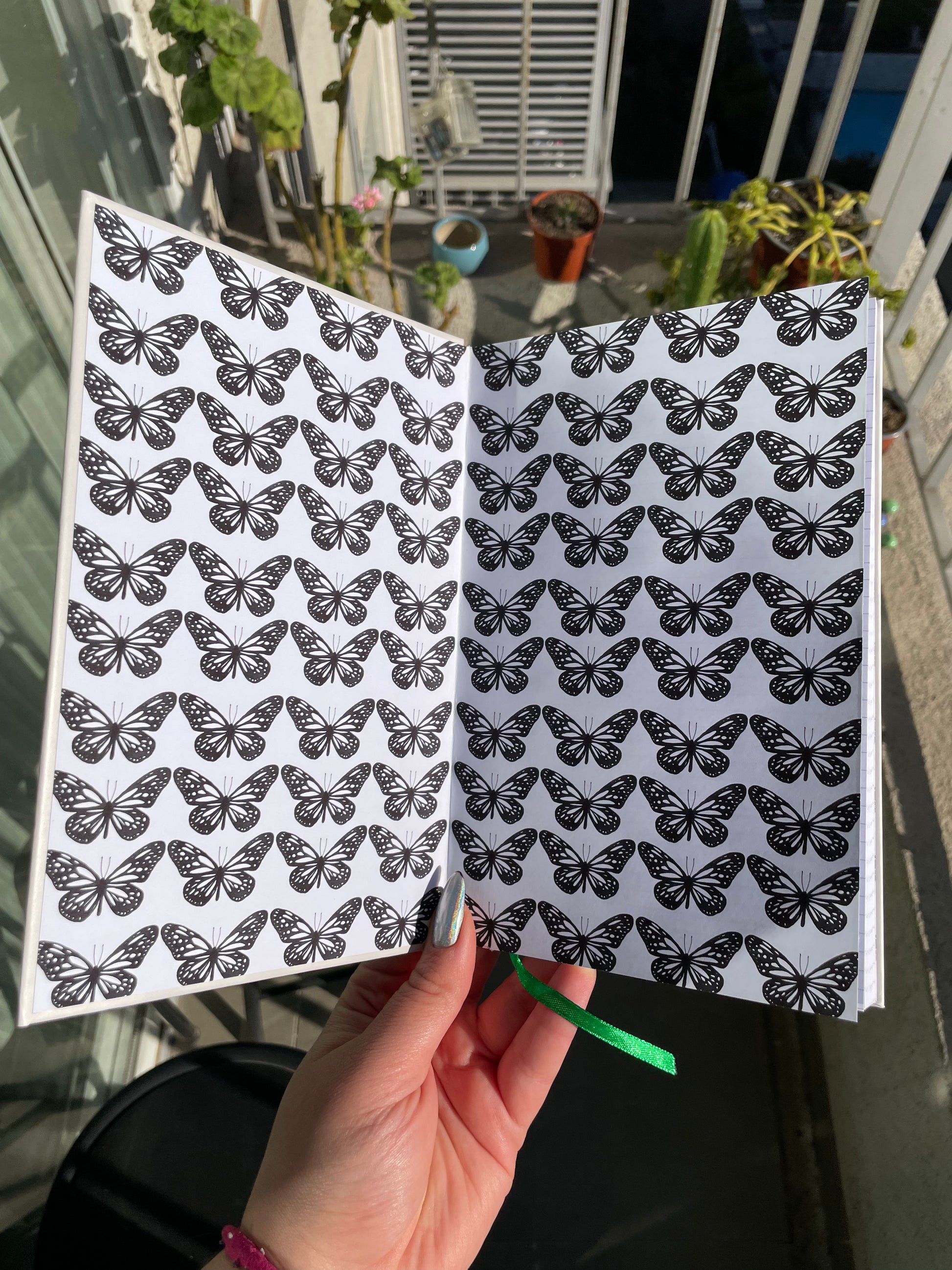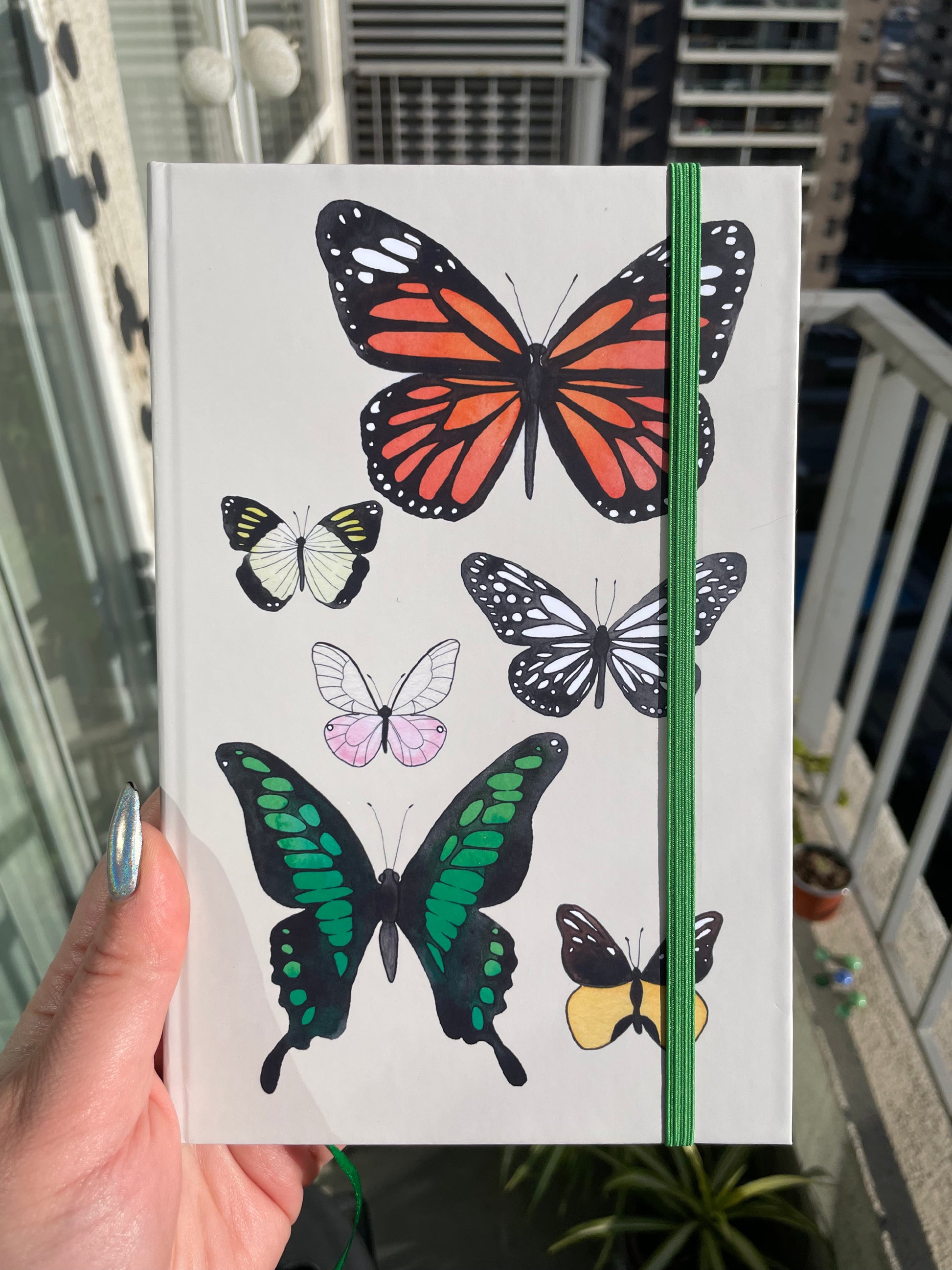 Agenda de mariposas, ambas tapas ilustradas con diferentes diseños.