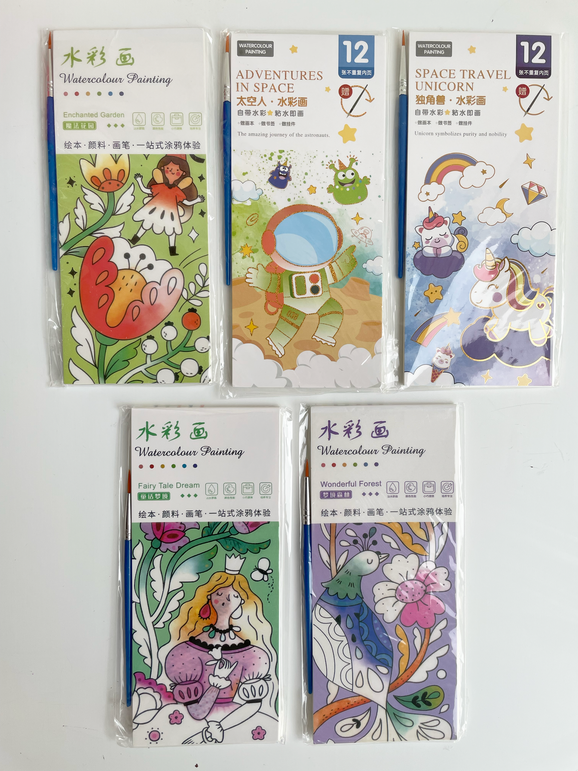 Cada libro incluye 12 ilustraciones con sus acuarelas, ademas de un pincel.